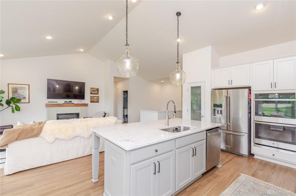 This beautiful brick home offers eye-catching curb appeal and over 2,900 square feet of well-designed living space. With 4 bedrooms and 3 full baths, the open floor plan features cathedral ceilings and a bright, airy feel throughout. Two spacious bedrooms are located at the front of the home with easy access to a full bath. The gourmet kitchen includes a large island, quartz counters, counter bar seating, pantry, and double ovens, and flows seamlessly into the sunny dining area with a wall of windows and walkout to the back patio. The living room is open and inviting, perfect for entertaining or relaxing. The private owner's suite includes a large walk-in closet and a spa-like bath with a walk-in shower. A convenient laundry room is located just off the garage entry. The finished basement adds a generous family room with kitchenette, an additional bedroom currently used as an office, plus a second office space behind pocket doors. A large unfinished area provides great storage, and the 2-car garage includes additional storage space as well.
