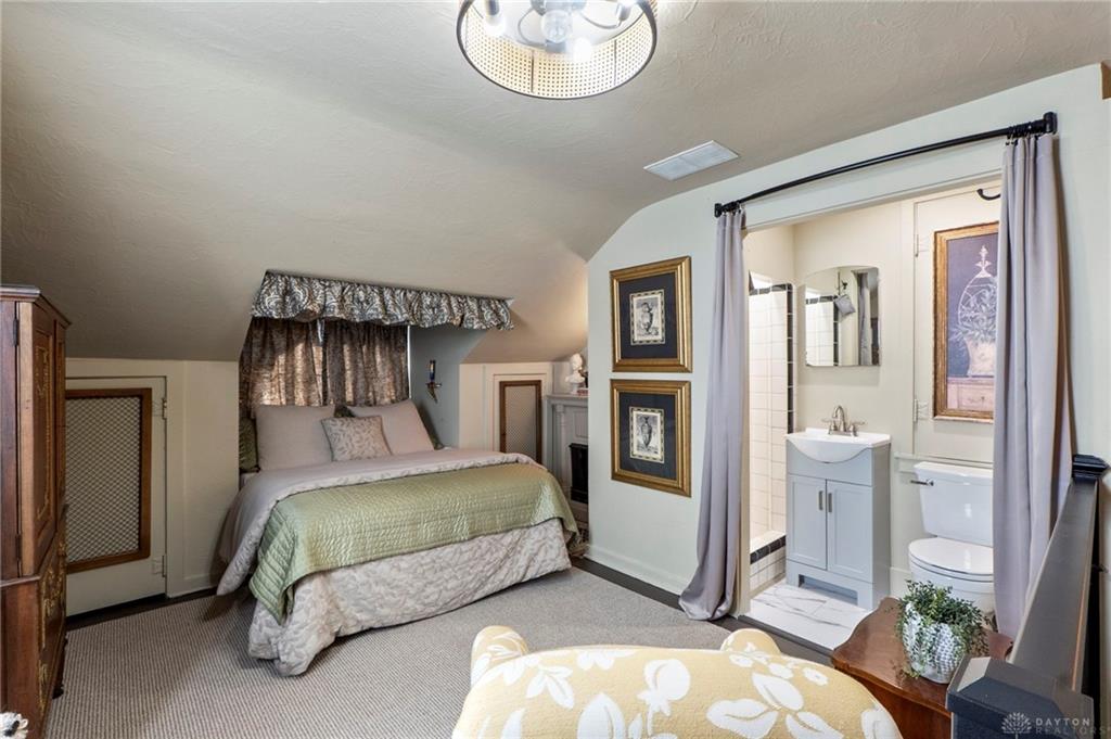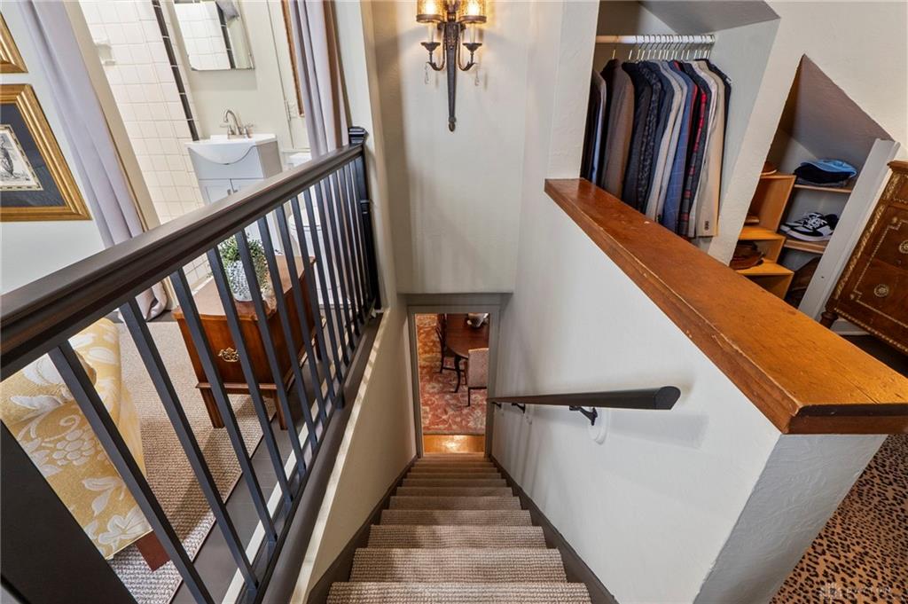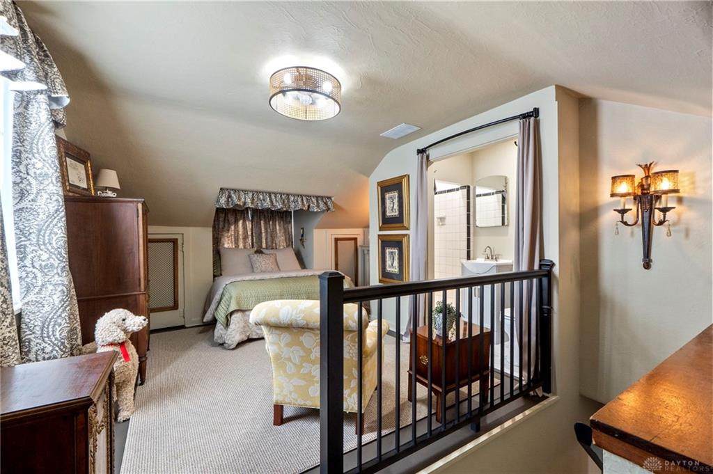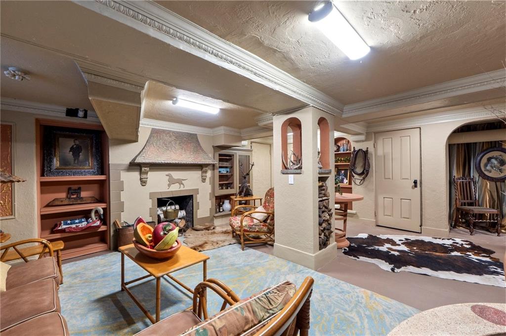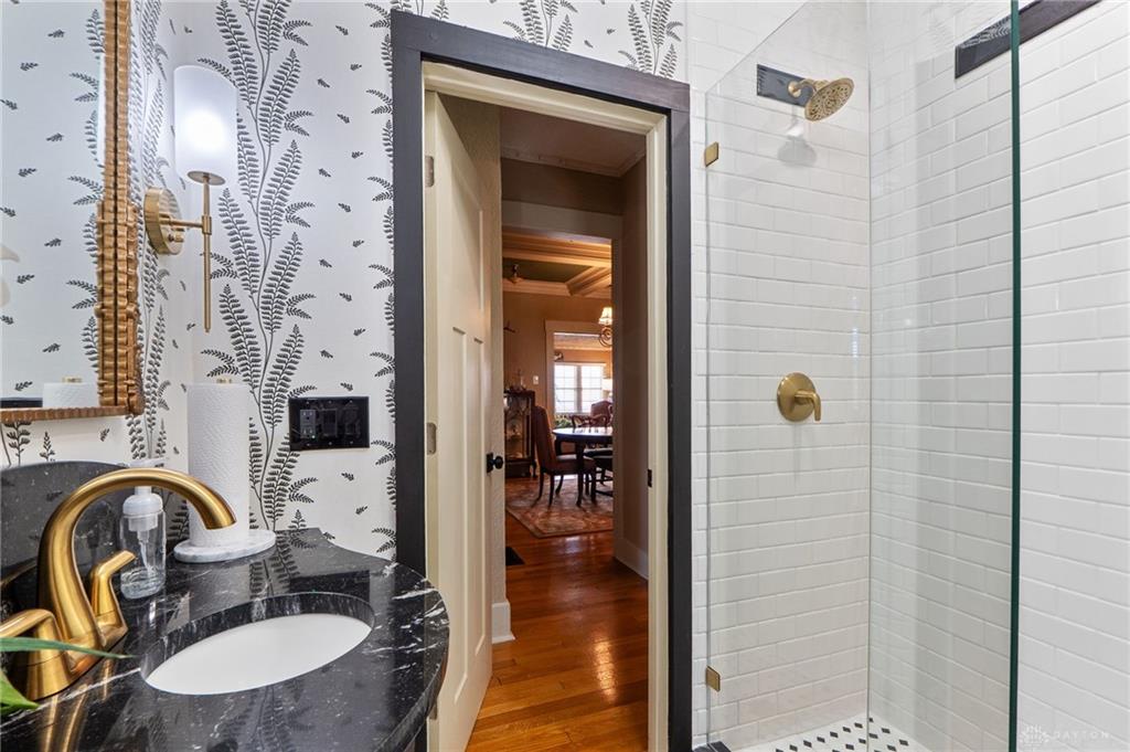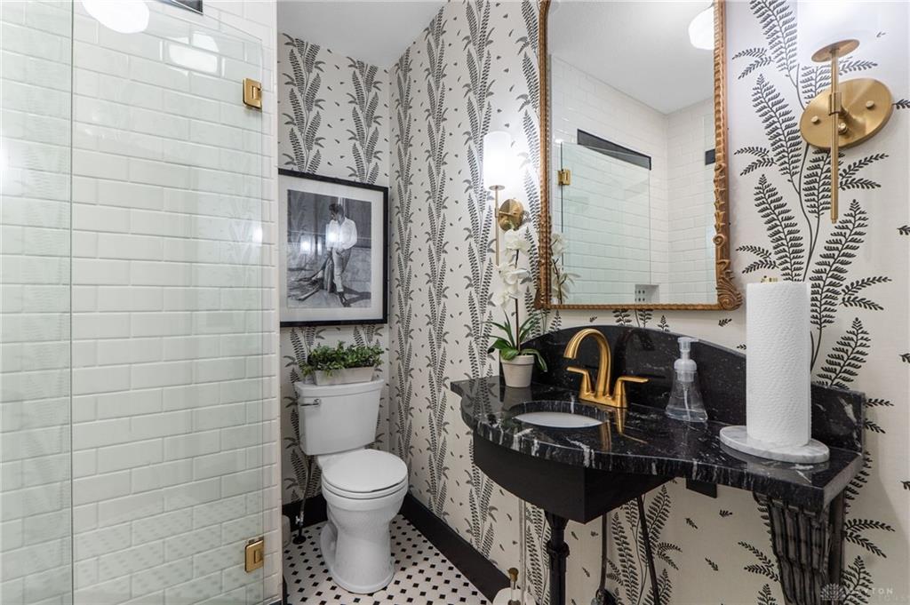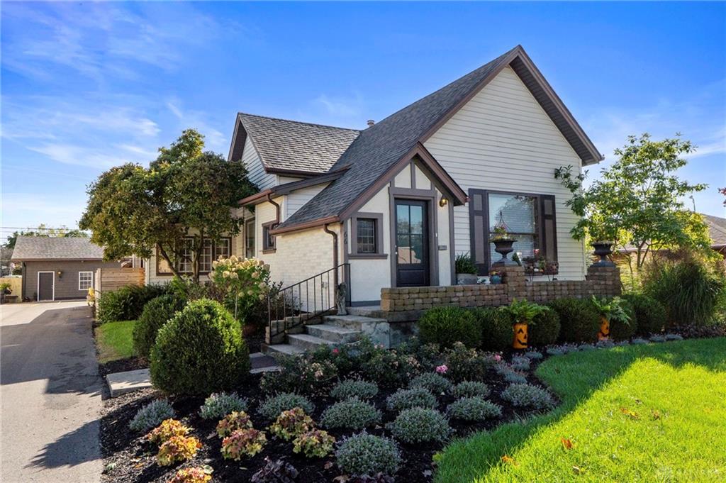 Experience timeless elegance and modern versatility in this beautifully updated Tudor-style home offering 1,939 square feet of living space, three bedrooms, two full bathrooms, and one half bathroom, plus a partial basement. From the moment you arrive, the home’s storybook architecture captures attention with its steep rooflines, decorative trim, and manicured landscaping framed by blooming shrubs and mature greenery. Inside, historic character meets contemporary design through arched entries, crown molding, and warm hardwood flooring. The kitchen is a true centerpiece—featuring rich cabinetry with brass hardware, open shelving, dark granite countertops, a farmhouse sink, and a striking two-tone ceiling accent that adds warmth and dimension. Each bathroom has been meticulously updated, blending vintage charm with today’s modern style. The main-level bath showcases black-and-white patterned tile, elegant botanical wallpaper, gold fixtures, and a glass-enclosed walk-in shower with subway tile. Every detail exudes refinement and craftsmanship. The partially finished basement provides a one-of-a-kind retreat, designed with custom trim work, warm lighting, and decorative plaster details. This inviting space features a stone accent wall with an artistic centerpiece, built-in shelving, and plenty of room for lounging or entertaining—offering the perfect atmosphere for a home theater, wine lounge, or creative studio. A standout feature of this property is the 800-square-foot finished garage-like space—perfect for a home business, salon, studio, or golf simulator setup. This flexible area offers unparalleled adaptability for both personal and professional use. With its ideal blend of architectural charm and modern function, this Tudor is a rare opportunity to own a home that’s as distinctive as it is practical—ready to accommodate both lifestyle and creativity.