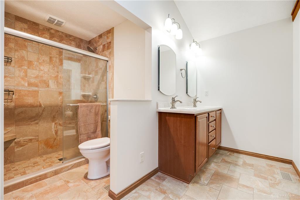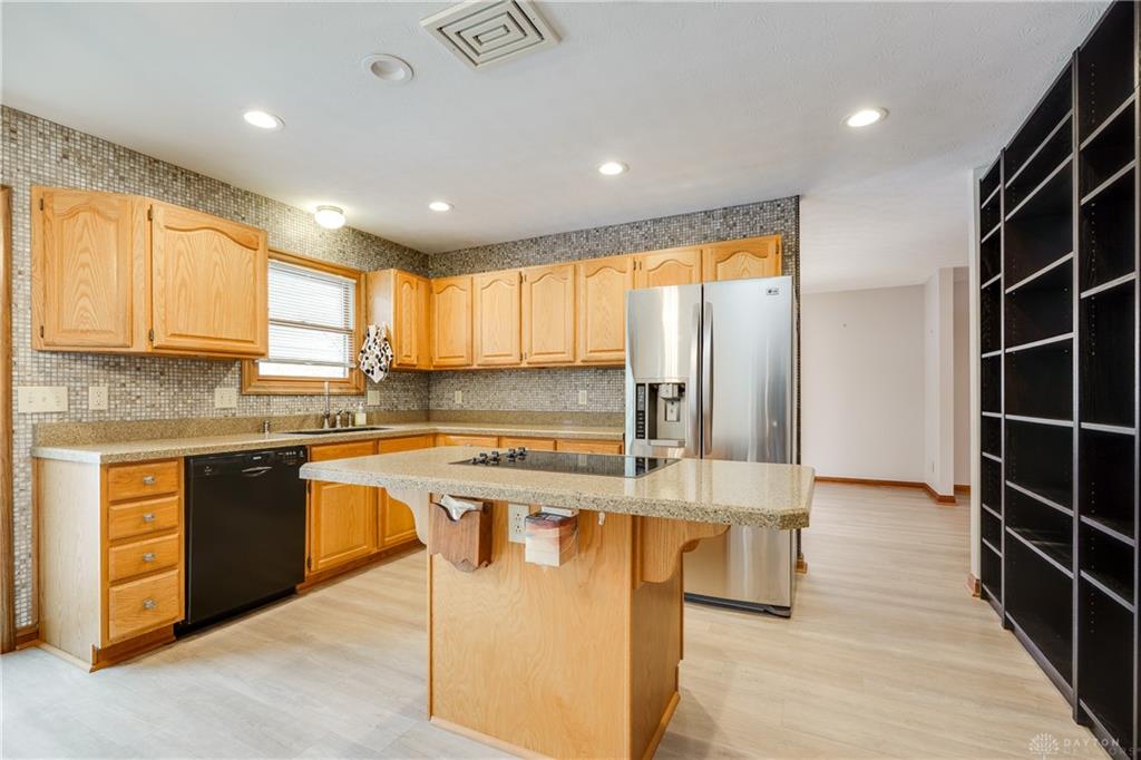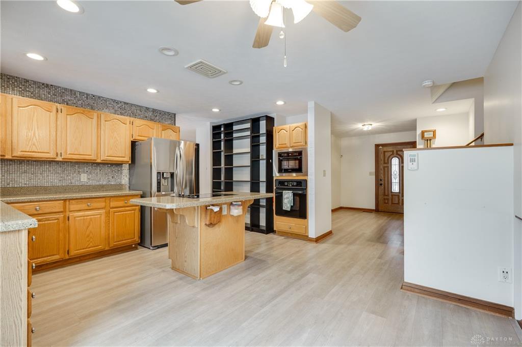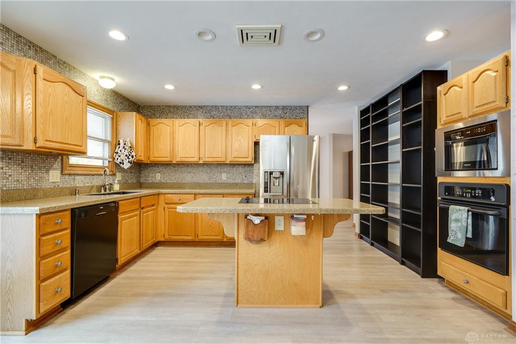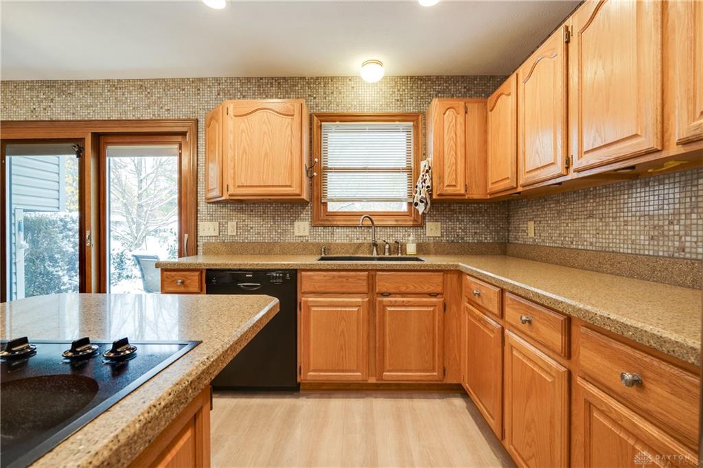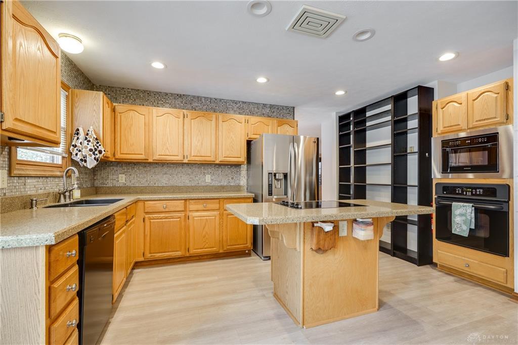 Beavercreek Schools! This 2460 sq. ft. tri level comes with four spacious bedrooms and three full baths. You will love the 28 x 7 covered front porch. Entry with hardwood plank flooring. Large dining room is open to the formal living room. The kitchen comes with a cooktop island, an abundance of cabinetry and counter tops with a granite transformation. All kitchen appliances stay including the convection microwave oven. On the lower level you will find a spacious family room with a ventless gas fireplace, a bedroom, full bath, laundry room and access to the extra wide, extra deep oversized two-car garage with a large, floored overhead storage area with lights. Upper level has three bedrooms and guest bath. Primary bedroom has vaulted ceiling with two skylights, a full bath with a skylight, a shower, heated floors and a walk-in closet. A/C unit new in 2024. Water softener new in 2021. Water heater new in 2019. Roof new in 2011. Leaf filter installed on gutters in 2015. The house comes with a whole house generator. 16x20 Shed. KOI pond. A 16 x 20 "On" ground pool with a deck. The outside hose bibs were replaced in 2015 and are connected to a well for the pool and outside watering needs. Extra parking pad. This house is move-in ready!
