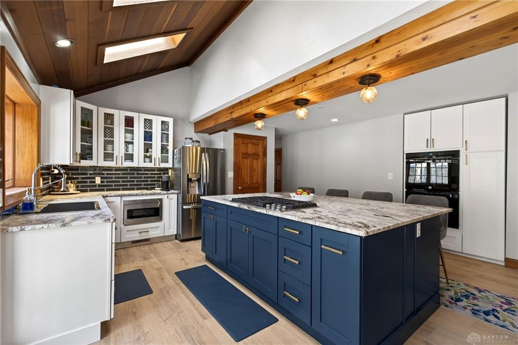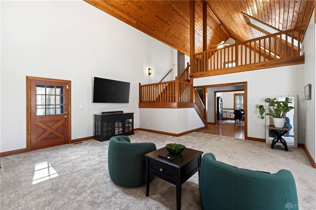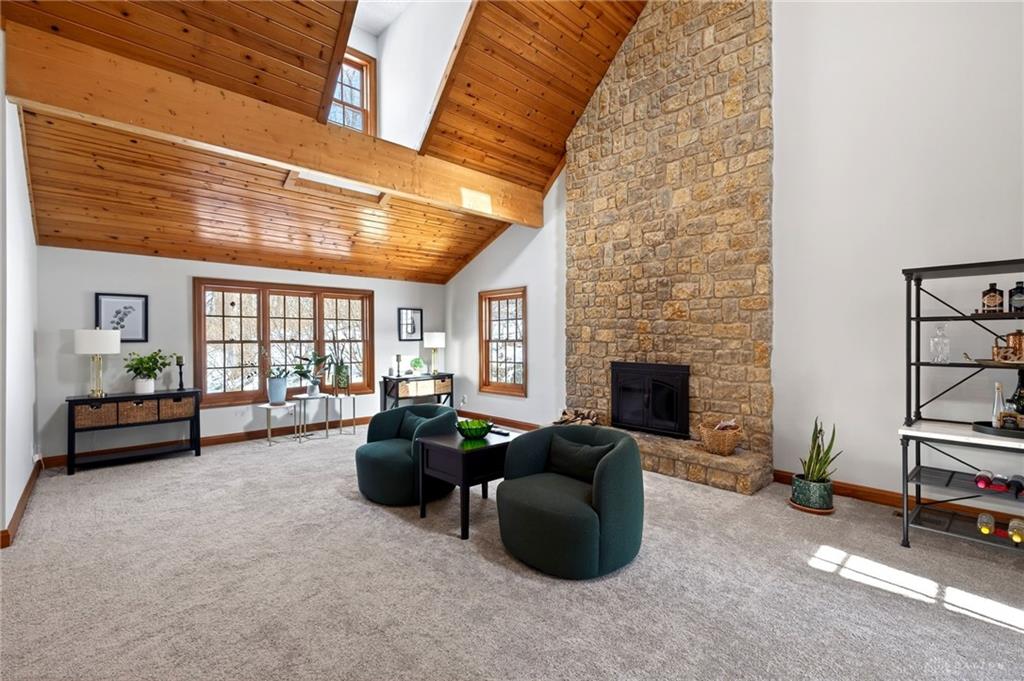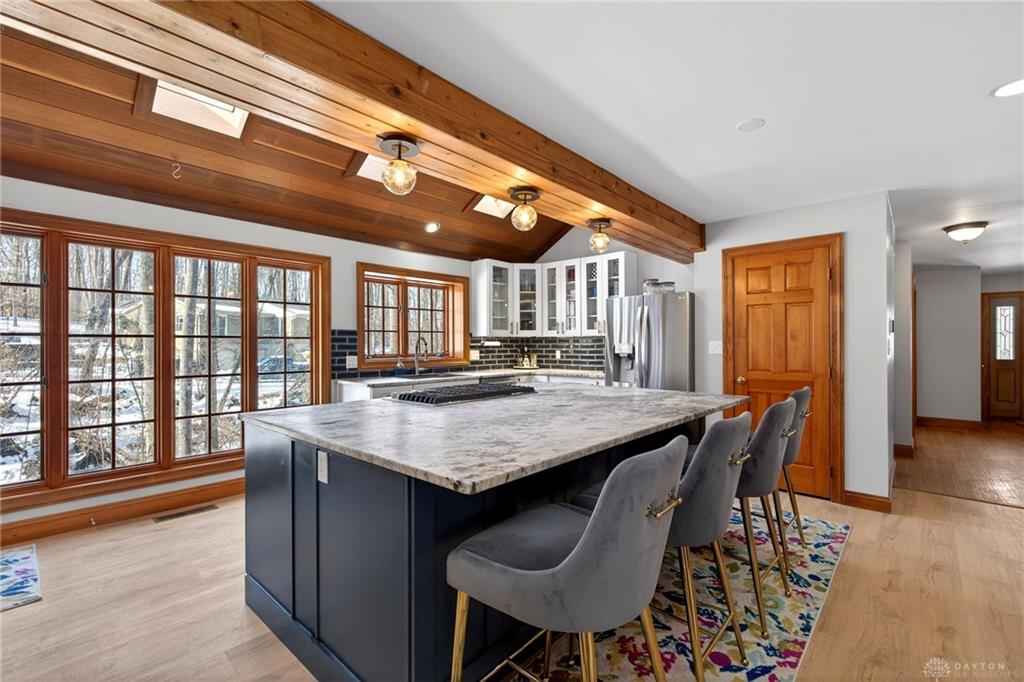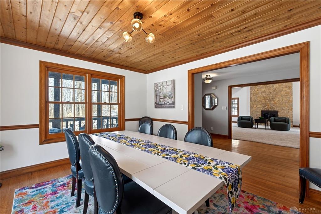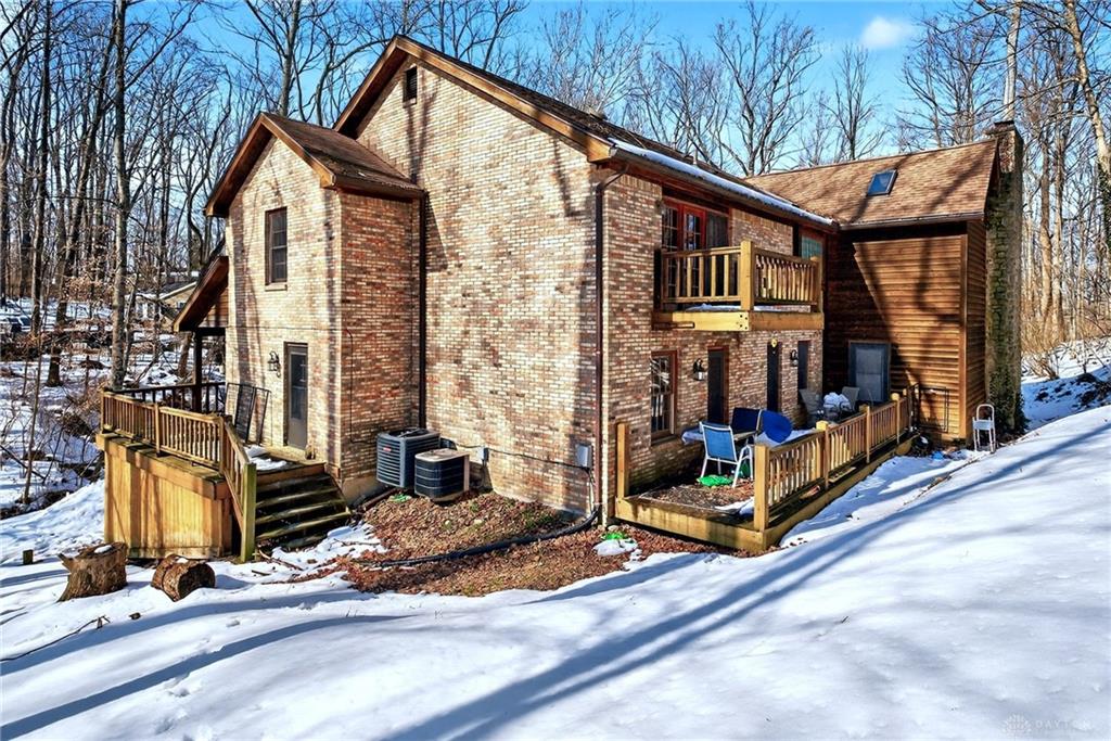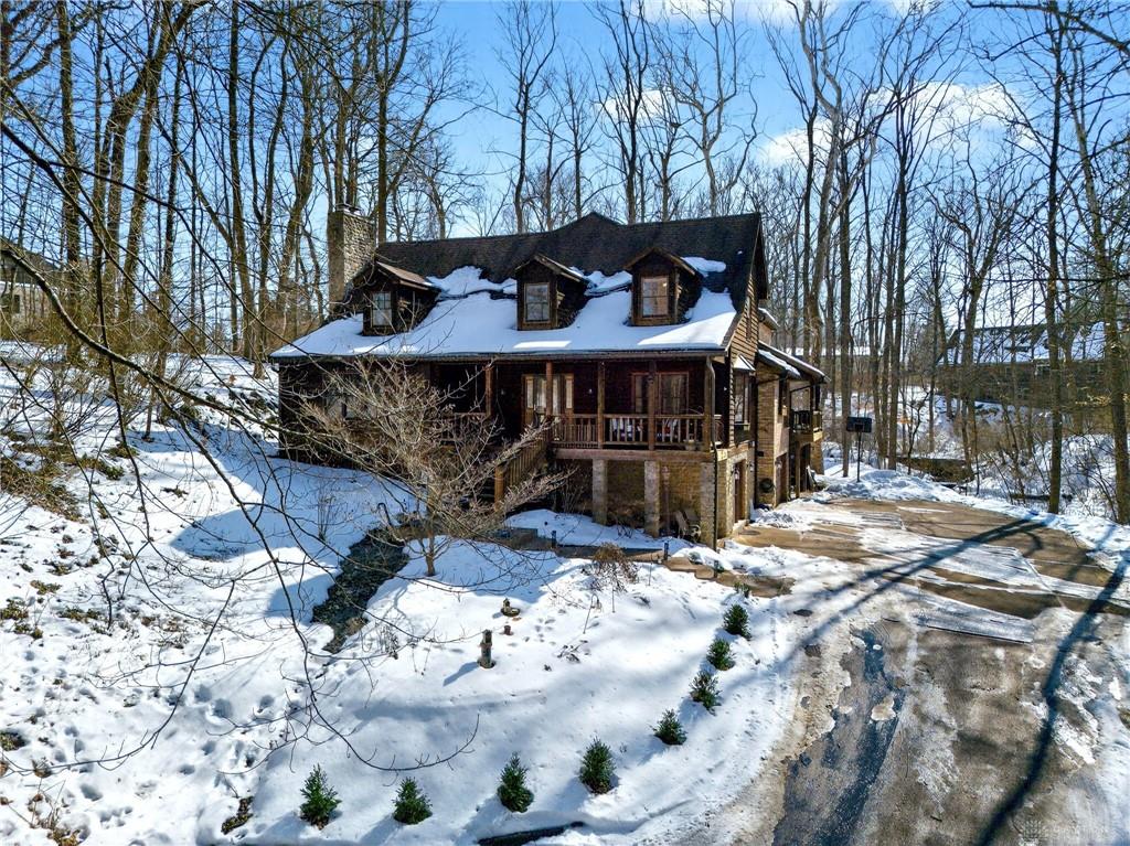 Welcome to a rare private estate opportunity in the heart of Washington Township. Recently updated and situated on 1.84 secluded wooded acres in the highly sought-after Centerville School District, this exceptional 4 bedroom, 3 full and 2 half bath home offers over 4,000 square feet of living space, combining architectural character, modern updates, and privacy rarely found in this prime location. From the moment you arrive, the private approach and mature trees create an immediate sense of seclusion and retreat. Inside, you are greeted by beautiful hardwood floors and a breathtaking great room featuring a soaring two-story wood-burning fireplace, vaulted pine ceilings, and expansive windows that fill the home with natural light and peaceful wooded views. Multiple elevated decks extend the living space outdoors, creating ideal spaces for relaxing or entertaining. The recently updated kitchen features a large center island with leathered granite countertops, abundant cabinetry, spacious pantry, and direct access to outdoor living areas. The adjoining dining area showcases warm architectural detail and scenic views of the surrounding acreage. The main level also includes well-appointed secondary bedrooms, a Jack and Jill bath, and convenient laundry room. The private owner’s suite offers a remodeled en-suite bathroom, walk-in closet, and exclusive elevated deck overlooking the wooded landscape. An additional bedroom, full bath, and open loft overlooking the great room provide flexible living space. The finished walk-out lower level offers a spacious family room, recreation area, storage, and direct outdoor access. A three-car garage and nearly two acres of wooded privacy complete this exceptional offering. Move-in ready and ideally located just minutes from The Greene, Austin Landing, I-675, parks, shopping, and dining, this is a rare opportunity to own a true private retreat.