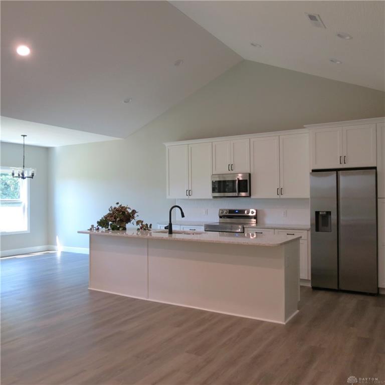 NO HOA! Finished and ready for YOU! 3 bedrooms and 2 full baths offering 1,648 sq. ft. of living area plus a 525 sq. ft. 2 vehicle garage with attic storage above. A covered front porch opens to a comfortable great room with a vaulted ceiling and a gas fireplace with a stone frame. The open and fully equipped kitchen features quartz countertops on the island and on the work spaces. The open design is a perfect presentation of the great room and opens to the dining area and has access to the covered open porch to the back. The owner’s suite is private and has an ample walk-in closet and a full bath featuring a walk-in shower. The other 2 bedrooms are on the other side of the home and are separated by a full tub bath and with each having double closets. Solid poplar doors and waterproof LVP flooring are in place throughout the home.
