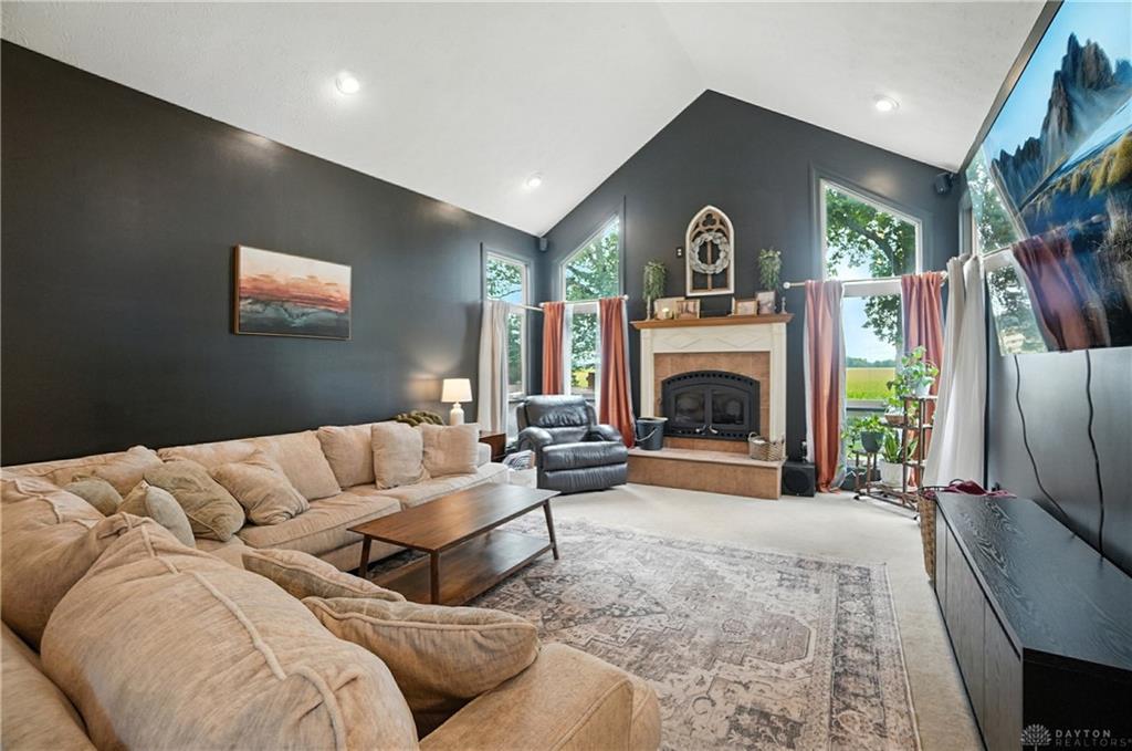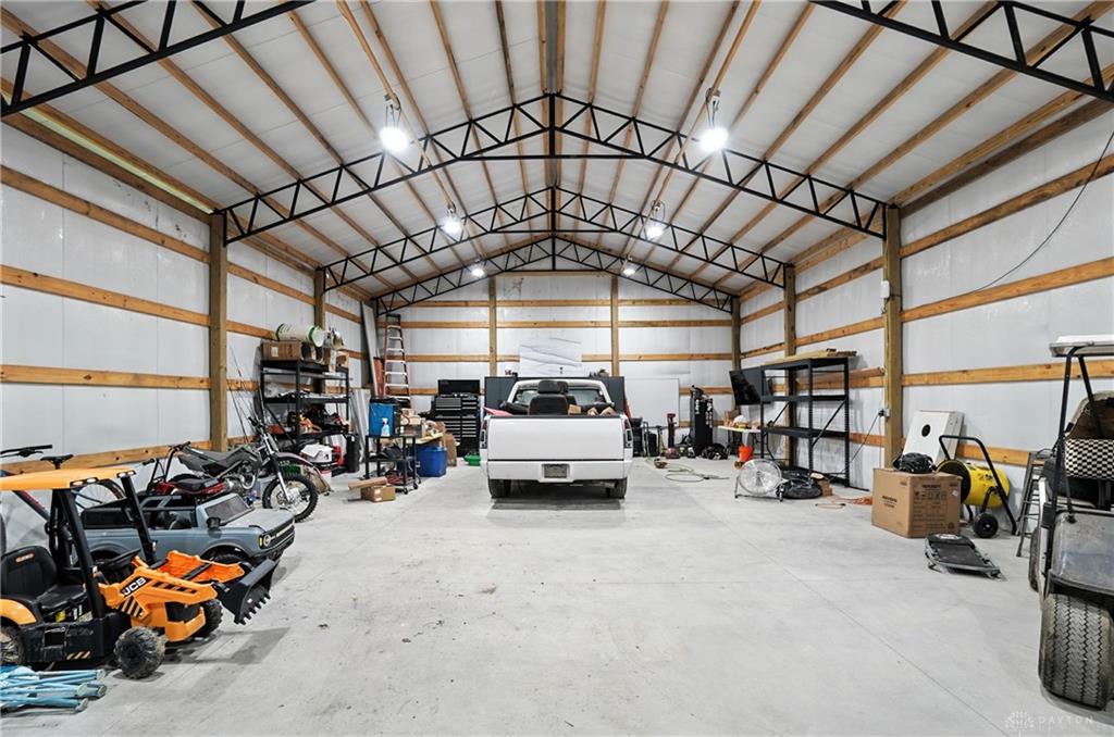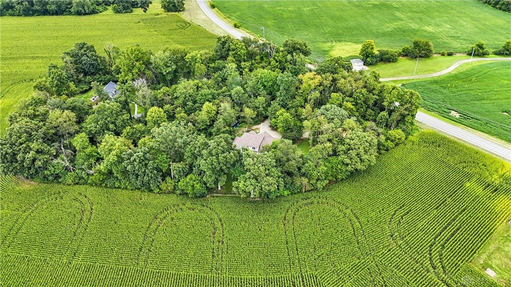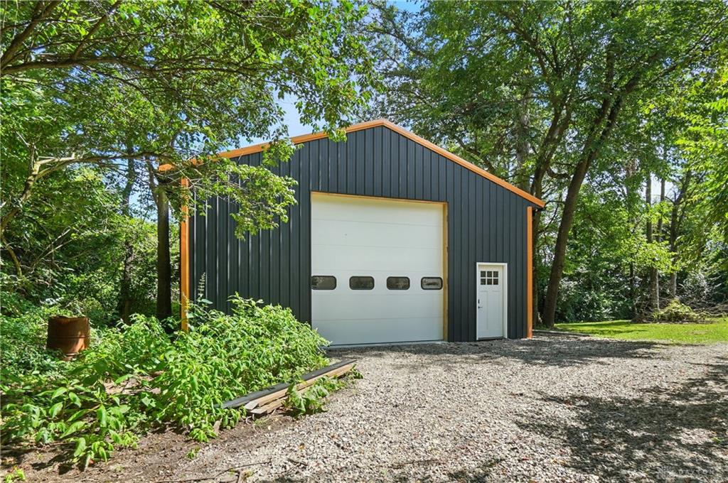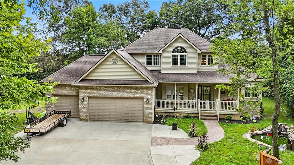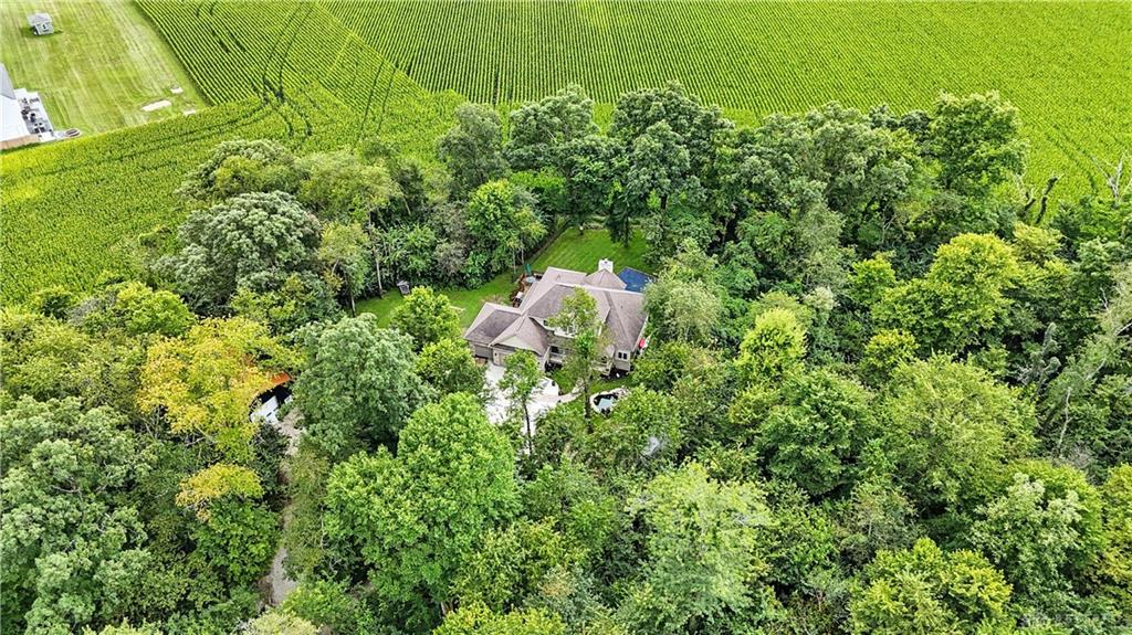 Welcome to your private retreat on 2.46 wooded acres, offering total seclusion while surrounded by peaceful farmland. The koi pond in the front yard warmly welcomes you home, setting the tone for this elegant and tranquil estate. Inside, the first-floor owner's suite features vaulted ceilings, abundant natural light, a spa-inspired jetted soaking tub, double vanity, walk-in shower, private water closet, and spacious walk-in closet. The gourmet kitchen boasts high-end appliances, custom granite countertops and backsplash, and new designer lighting. Fanstastic breakfast area off of the kitchen. Storage here is not an issue! A dramatic wall of windows in the great room highlights the vaulted ceilings and wood-burning fireplace with blower. The formal dining room and grand foyer add to the home's executive feel with updated fixtures and architectural detail. Additional conveniences on the 1st floor include a remodeled half bath, laundry room, and coat closet off the entry. The finished lower level is an entertainer's dream with a theater area (sofa stays), billiards space (pool table stays), kitchenette with bar and refrigerator, new full bath with walk-in shower, tanning bed, built-ins, generous storage, and even a hidden panic room. Outdoors, enjoy the rear deck, patio with children's slide, fenced play area with rubber mulch, and the peaceful natural setting. Car enthusiasts will love the insulated 3-car garage with soaring ceilings, plus the brand-new 50x30 outbuilding featuring 6' concrete floors, electric, insulation, Spectrum high-speed internet, and a full loop driveway. With 200-amp service, a new sump pump, efficient heat pump, and highly functional all-electric systems, this home blends modern luxury with thoughtful practicality. From the welcoming koi pond to the vaulted ceilings and refined finishes, every detail has been designed for comfort and sophistication. (Shed does not stay). Call today for your own private tour of this one of a kind home.