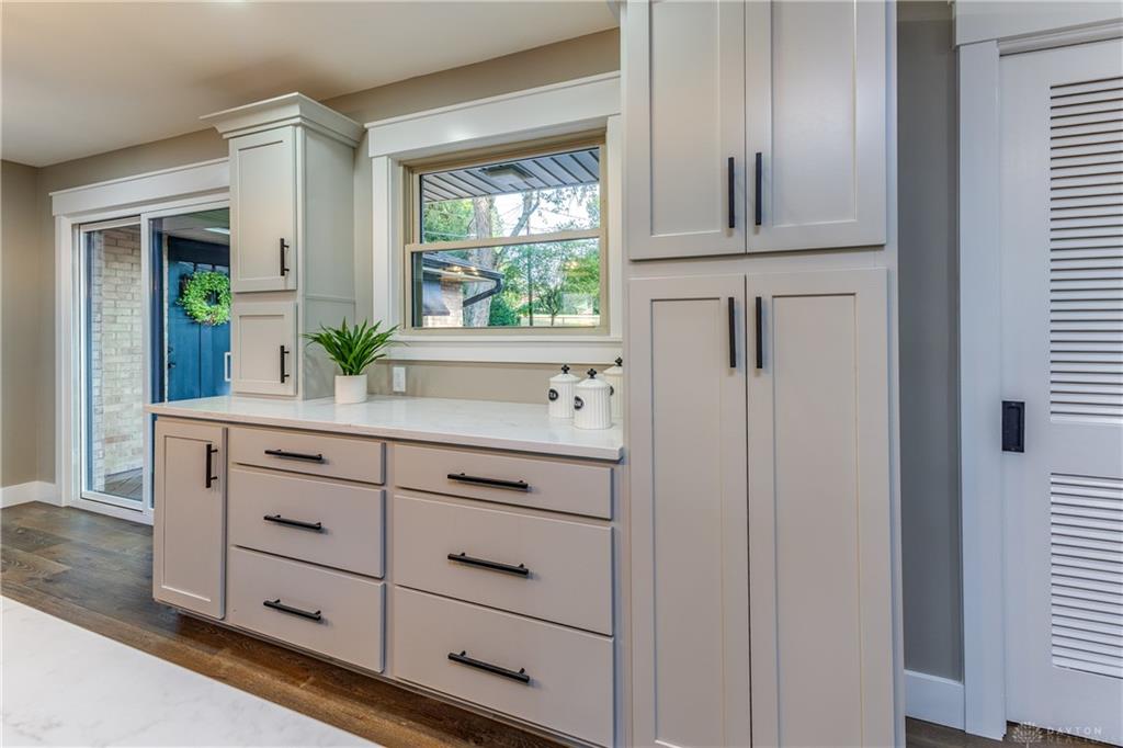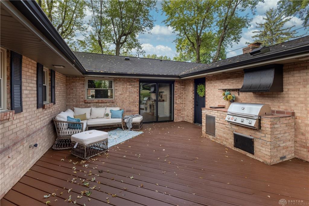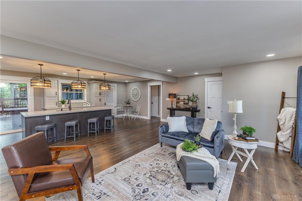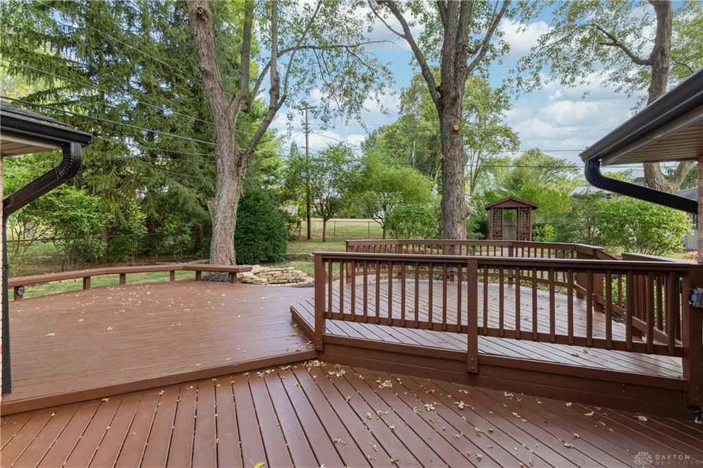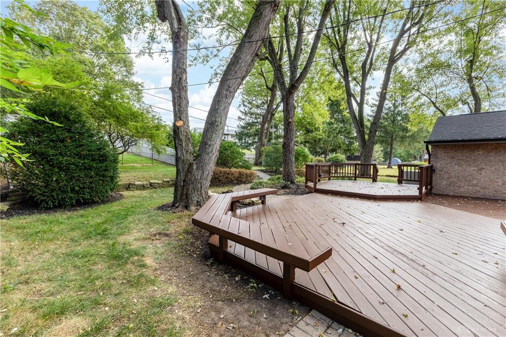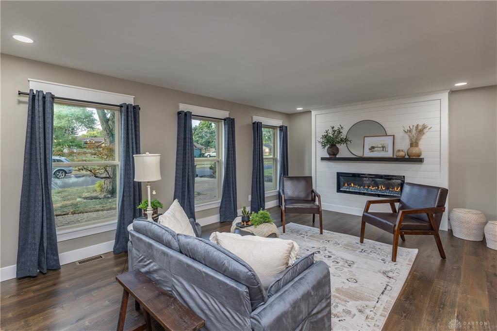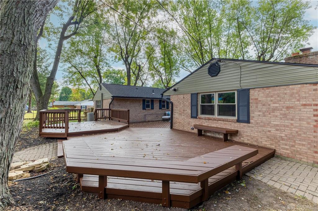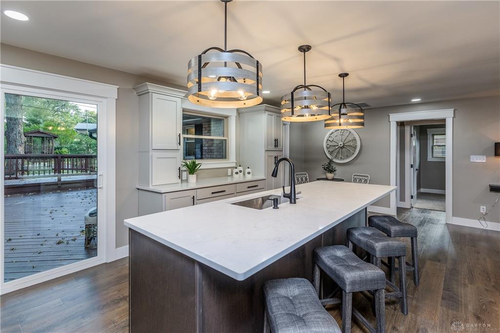 Welcome to this beautifully updated 4-bedroom, 2-bath home nestled in a serene, park-like setting in the heart of Kettering. Thoughtfully redesigned from top to bottom, this home offers over 1950 sq ft with a completely open-concept layout and designer finishes throughout. Beginning with the feature wall with an electric fireplace perfect for cozy evenings. The spacious kitchen is complete with quartz countertops, self-closing cabinetry, a large center island and stainless steel Bosch appliances. Off the kitchen there is now a custom food pantry with a pass through to the new laundry room. The fourth bedroom is currently staged as a comfortable family room, offering flexibility to fit your lifestyle. Both bathrooms have been completely remodeled with contemporary fixtures and finishes. Additional updates include all-new flooring, drywall, wood trim, and solid wood interior doors with updated door casings and modern hardware. Stylish new lighting fixtures brighten every space, while double-hung windows provide energy efficiency and curb appeal. Freshly painted inside and out, the home also features a newer roof and gutters, new garage door, and all new exterior doors, including a sleek new sliding glass door that opens to the expansive three-level deck perfect for relaxing or hosting guests with the built-in gas grill. Take a step down off the deck to walkways that lead to the second tier of the backyard with a large shed with electric-ideal for a workshop, hobby space, or extra storage.