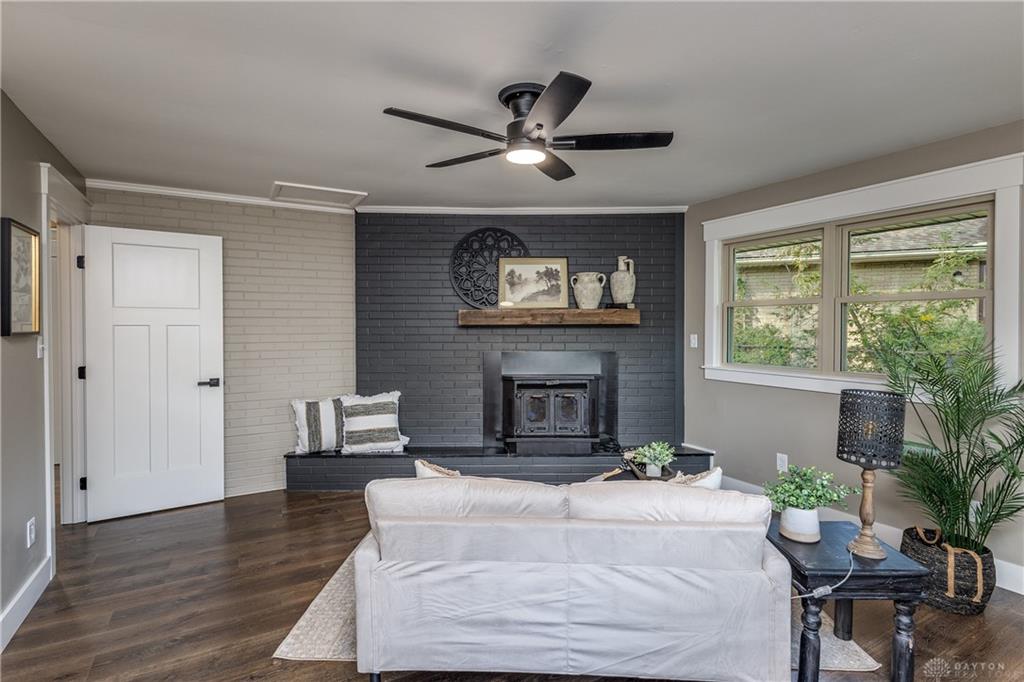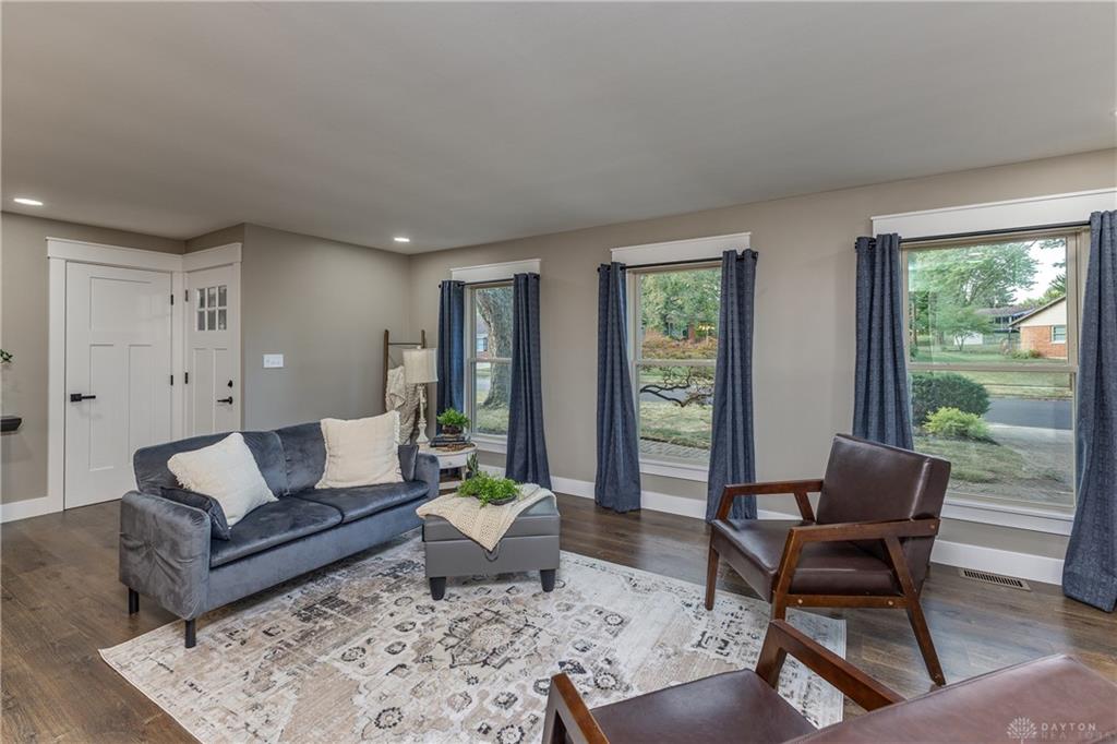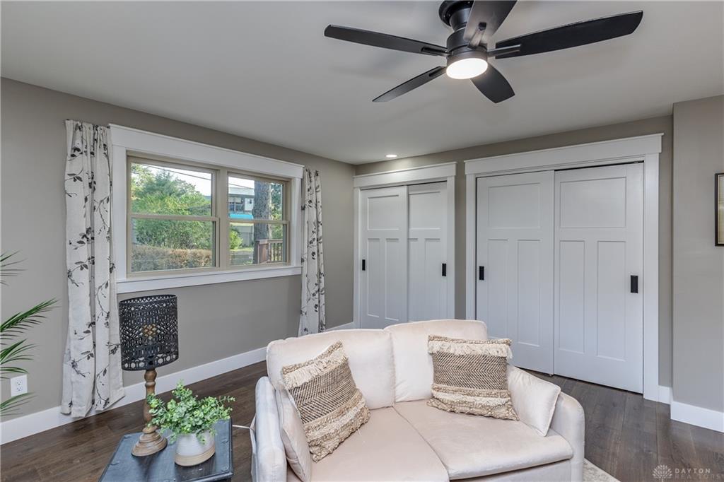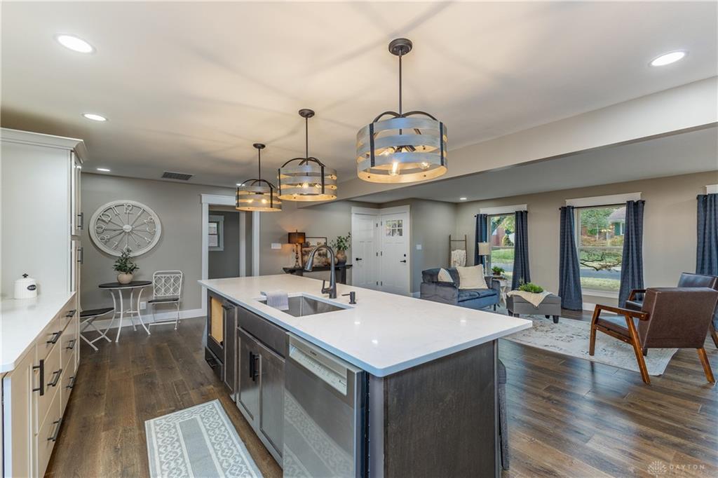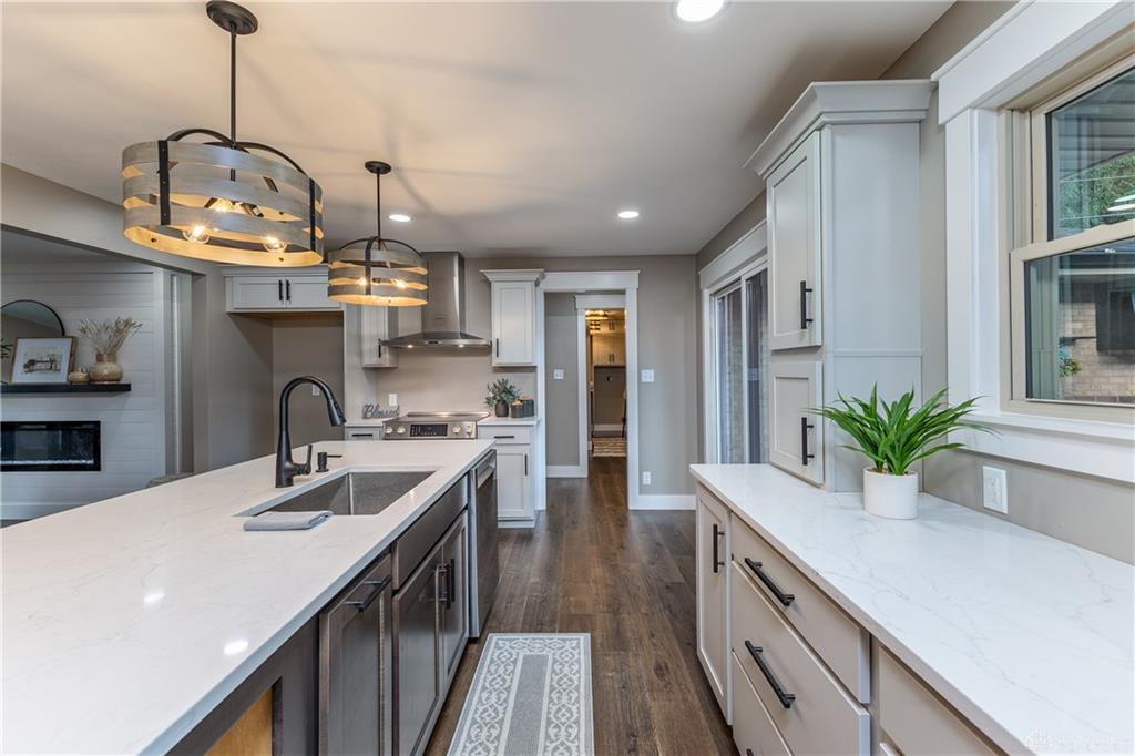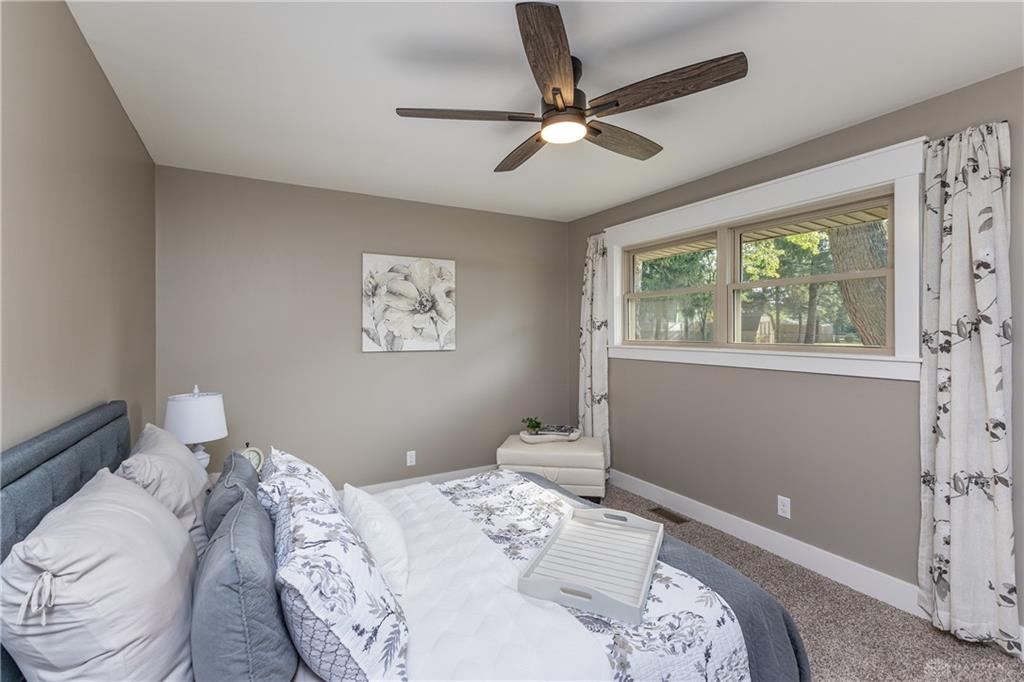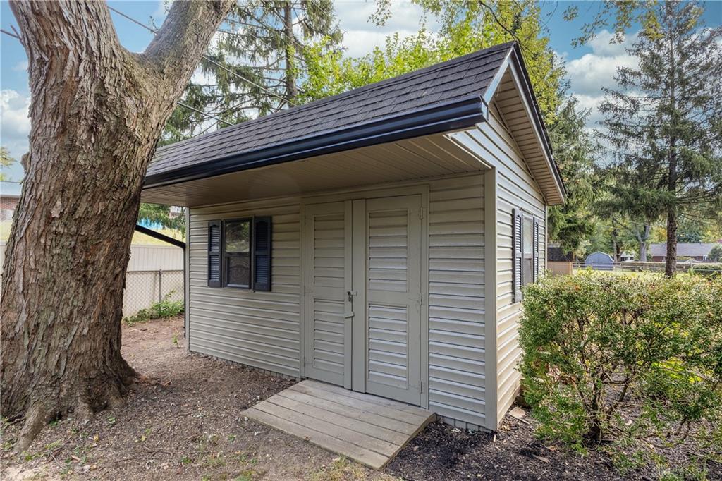 Welcome to this beautifully updated 4-bedroom, 2-bath home nestled in a serene, park-like setting in the heart of Kettering. Thoughtfully redesigned from top to bottom, this home offers over 1950 sq ft with a completely open-concept layout and designer finishes throughout. Beginning with the feature wall with an electric fireplace perfect for cozy evenings. The spacious kitchen is complete with quartz countertops, self-closing cabinetry, a large center island and stainless steel Bosch appliances. Off the kitchen there is now a custom food pantry with a pass through to the new laundry room. The fourth bedroom is currently staged as a comfortable family room, offering flexibility to fit your lifestyle. Both bathrooms have been completely remodeled with contemporary fixtures and finishes. Additional updates include all-new flooring, drywall, wood trim, and solid wood interior doors with updated door casings and modern hardware. Stylish new lighting fixtures brighten every space, while double-hung windows provide energy efficiency and curb appeal. Freshly painted inside and out, the home also features a newer roof and gutters, new garage door, and all new exterior doors, including a sleek new sliding glass door that opens to the expansive three-level deck perfect for relaxing or hosting guests with the built-in gas grill. Take a step down off the deck to walkways that lead to the second tier of the backyard with a large shed with electric-ideal for a workshop, hobby space, or extra storage.