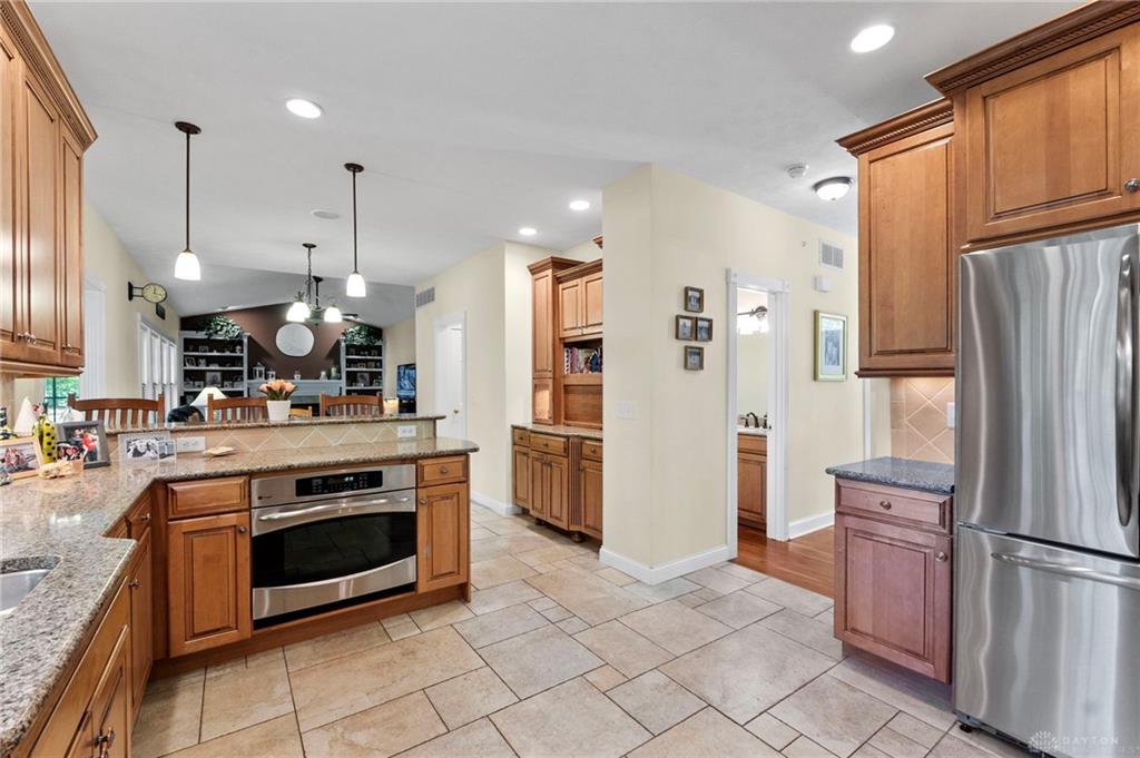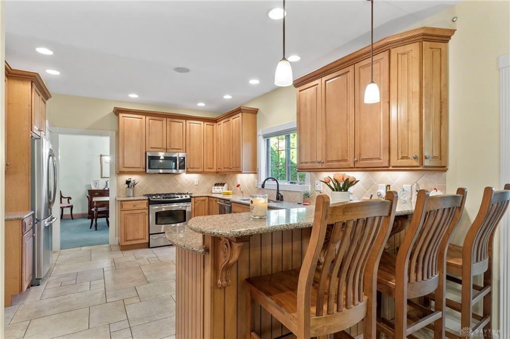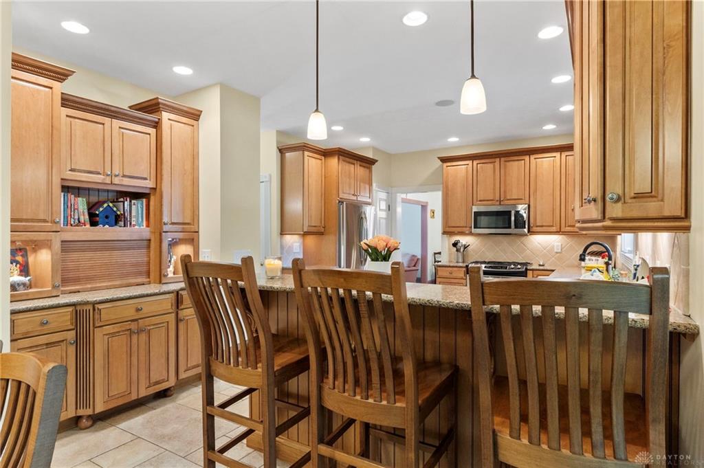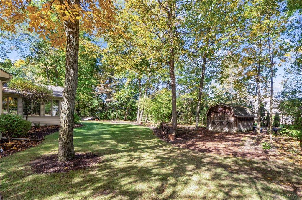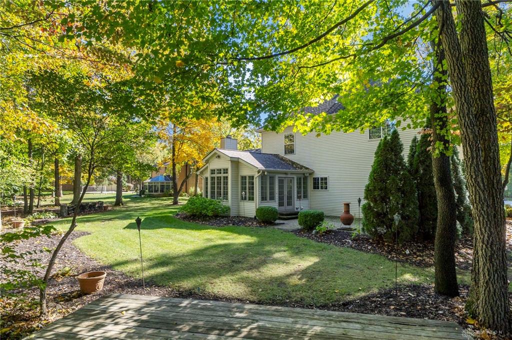 Fantastic custom home in sought-after Forest Edge, KR Schools, 4 beds, 2.5 baths, gorgeous sunroom, finished basement, half acre lot, 3 car side entry garage, all on a private cul-de-sac! The beautiful lot and landscaping greet you. Inside, you'll find an open entry with a sharp home office to your right. Custom built-ins are beautiful. To the left of the entry is a spacious living room. The formal dining room offers plenty of space for a large table. The custom kitchen is spectacular with tons of maple cabs w/ginger glaze finish, quartz tops, and updated stainless appliances. 2 full-size wall ovens, a large gas cooktop, spacious pantry, tile backsplash and flooring. So nice! The breakfast nook adjoins. The great room is huge and has a woodburning fireplace with gas starter. A sunroom has been added with gorgeous views of the rear property from 3 walls of windows. A 48-bottle wine chiller is nestled into the cabinetry. In-ceiling speakers connect to the provided receiver for music throughout kitchen, sunroom and outdoor patio. Fantastic! Upstairs, you'll find spacious bedrooms. The master suite is huge and offers built-ins, and a gracious master bath with walk-in shower, jetted tub, walk-in closet and in-ceiling speakers in bedroom and bath. In the lower level you'll find a massive rec room and absolutely tons of storage space. Outside, a private rear yard to enjoy with paver patio, deck with 120/240 volt breaker box, storage shed, and beautiful views! So many places to spend time with friends and family. Updates include: Newer Appliances, Sunroom Addition 2006, Roof 2015, HVAC 2017. Tons of storage, tons of natural light, irrigation system, underground portion of Invisible Fence, close to shopping, restaurants. Quick access to 68, 70, 675, 75, Columbus, Dayton. Hurry! Come see!