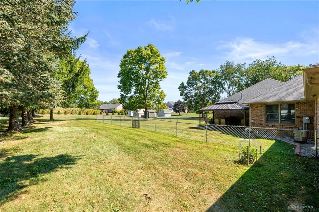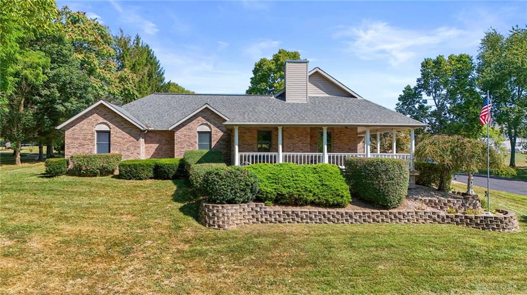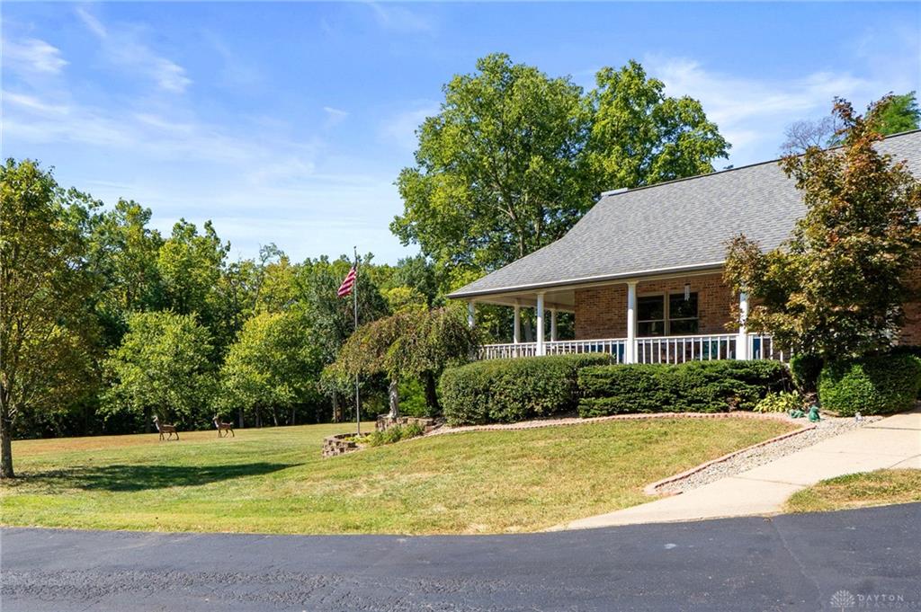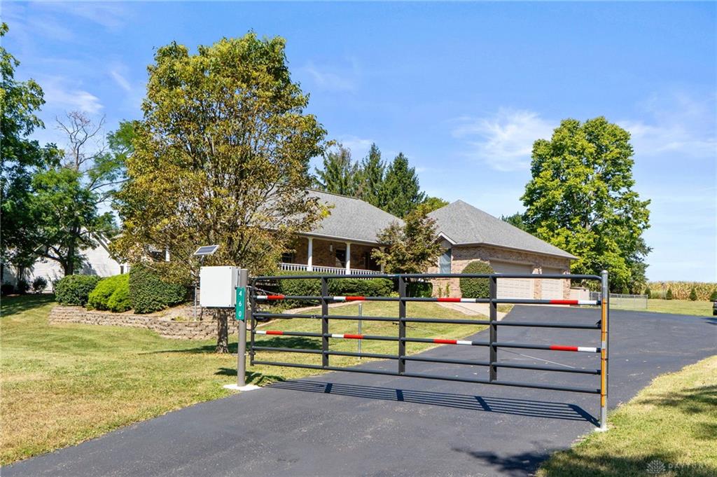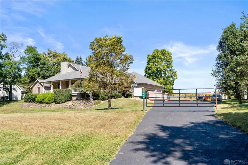 Welcome to this beautifully maintained brick ranch in Xenia, offering the perfect blend of space, craftsmanship, and modern comfort. Situated on two parcels totaling just under 1.5 acres, this property provides a serene setting with mature trees, manicured landscaping, and a sense of privacy rarely found so close to town. A long, paved driveway leads you to a new solar-powered entry gate (installed 2024) and an attached three-car heated garage with a new furnace. The inviting wrap-around covered front porch sets the tone for relaxed country living with timeless curb appeal. Inside, you’ll find an open and inviting layout accented by rich hardwood floors throughout the entry, kitchen, dining area, and hallway. The spacious living room features vaulted ceilings, plush new carpet (2023), and abundant natural light from multiple windows, creating a warm and welcoming gathering space. The kitchen offers generous cabinetry with custom wood finishes, updated stainless-steel appliances that convey, and a functional layout ideal for cooking and entertaining. Just steps away, the dining area provides seamless flow for everyday meals or hosting family gatherings. All three bedrooms are comfortably sized and carpeted, with solid six-panel wood doors and custom wood blinds adding a refined touch. The primary suite impresses with its vaulted ceiling, walk-in closet, and spa-like en suite bathroom featuring a dual-sink vanity, Jacuzzi soaking tub, and separate stand-up shower. The semi-finished basement expands your living options with a recreation area, dedicated tornado shelter/safe room, and ample storage. Outdoor living is equally inviting with a newly added gazebo, perfect for entertaining. Recent updates include: Solar-powered driveway gate (2024), New carpet (2023), Garage furnace (2023), Interior painting (2023), 12x16 gazebo addition.This exceptional property combines comfort, safety, and timeless design—ready to welcome its next owner to years of enjoyment.
