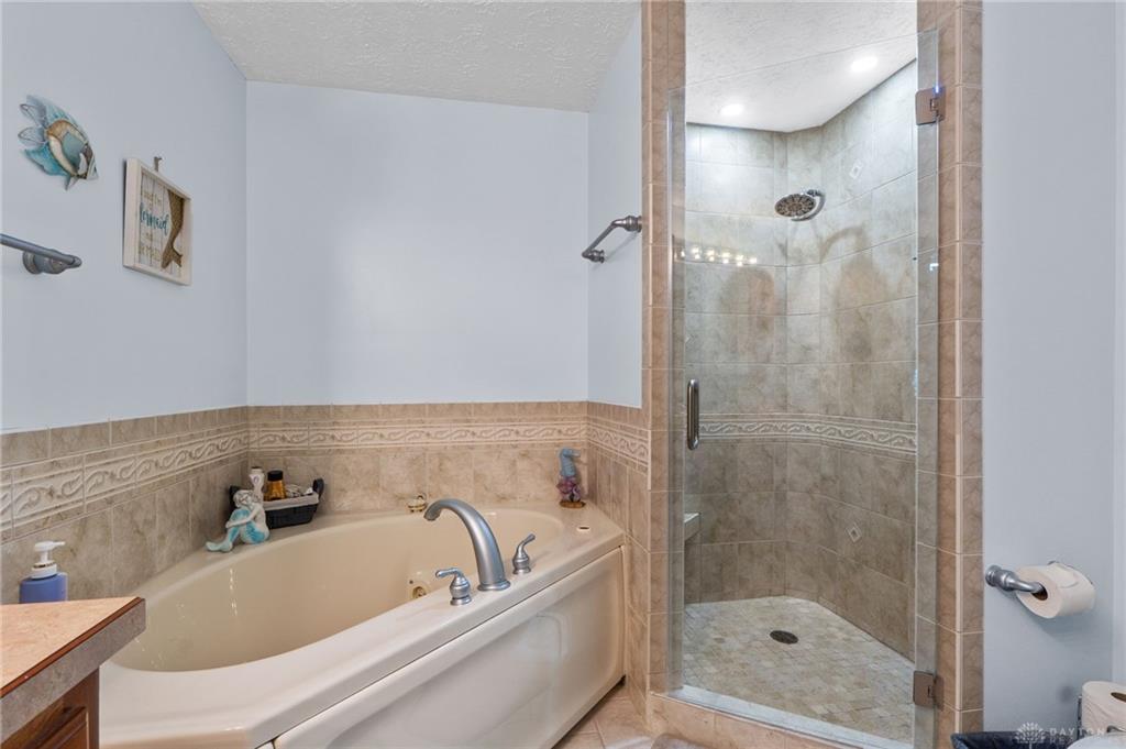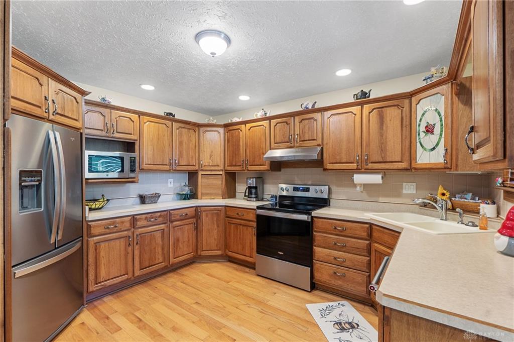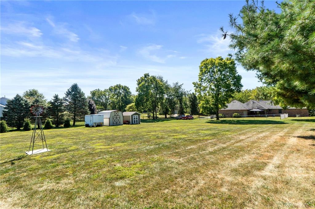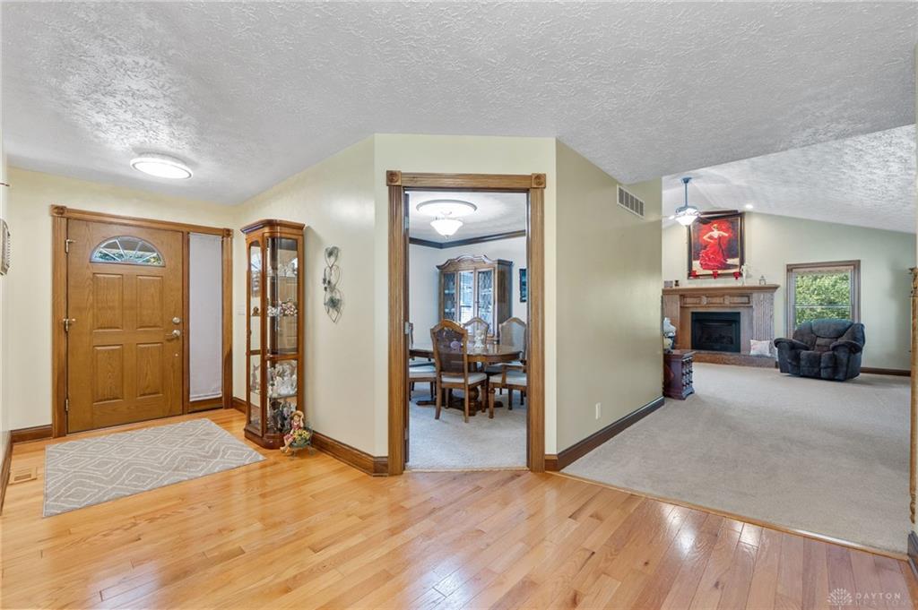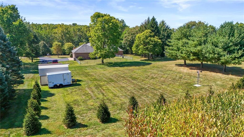 Welcome to this beautifully maintained brick ranch in Xenia, offering the perfect blend of space, craftsmanship, and modern comfort. Situated on two parcels totaling just under 1.5 acres, this property provides a serene setting with mature trees, manicured landscaping, and a sense of privacy rarely found so close to town. A long, paved driveway leads you to a new solar-powered entry gate (installed 2024) and an attached three-car heated garage with a new furnace. The inviting wrap-around covered front porch sets the tone for relaxed country living with timeless curb appeal. Inside, you’ll find an open and inviting layout accented by rich hardwood floors throughout the entry, kitchen, dining area, and hallway. The spacious living room features vaulted ceilings, plush new carpet (2023), and abundant natural light from multiple windows, creating a warm and welcoming gathering space. The kitchen offers generous cabinetry with custom wood finishes, updated stainless-steel appliances that convey, and a functional layout ideal for cooking and entertaining. Just steps away, the dining area provides seamless flow for everyday meals or hosting family gatherings. All three bedrooms are comfortably sized and carpeted, with solid six-panel wood doors and custom wood blinds adding a refined touch. The primary suite impresses with its vaulted ceiling, walk-in closet, and spa-like en suite bathroom featuring a dual-sink vanity, Jacuzzi soaking tub, and separate stand-up shower. The semi-finished basement expands your living options with a recreation area, dedicated tornado shelter/safe room, and ample storage. Outdoor living is equally inviting with a newly added gazebo, perfect for entertaining. Recent updates include: Solar-powered driveway gate (2024), New carpet (2023), Garage furnace (2023), Interior painting (2023), 12x16 gazebo addition.This exceptional property combines comfort, safety, and timeless design—ready to welcome its next owner to years of enjoyment.