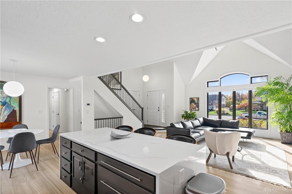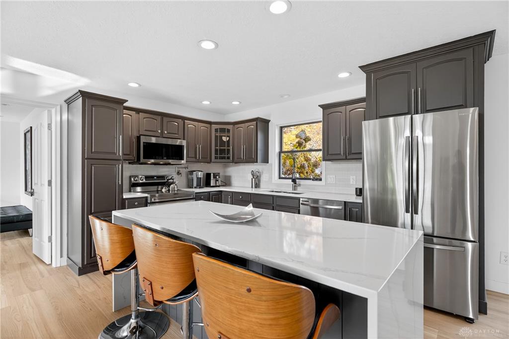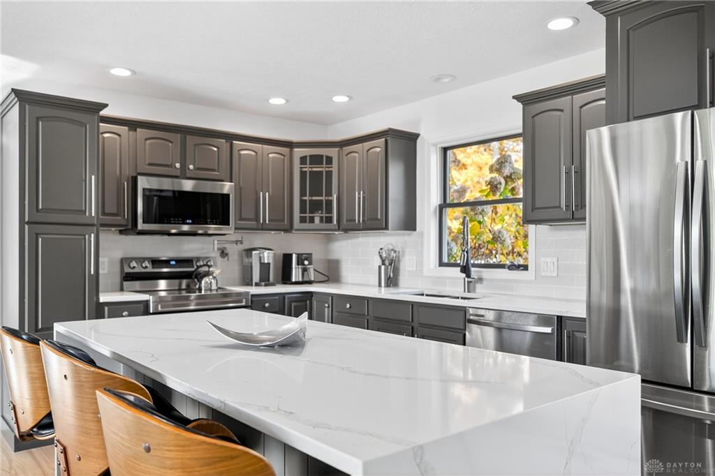 Welcome to 2355 Worthington Drive, Troy, Ohio - a beautifully renovated 5-bedroom, 2.5-bath home offering modern finishes, flexible living spaces, and thoughtful upgrades throughout. This move-in-ready property features a desirable first-floor primary suite and an open-concept layout perfect for comfort and entertaining. Step inside to an impressive vaulted ceiling on the first floor, creating an airy, spacious feel in the main living area. The space flows seamlessly into a stunning kitchen showcasing quartz countertops, a dramatic waterfall island, and new stainless-steel appliances - ideal for everyday living and hosting. The first floor includes two bedrooms: the primary suite with a beautifully updated bath featuring a walk-in shower with sliding glass doors, and a second bedroom that could also be a home office or guest room. Upstairs, you’ll find two additional bedrooms and a bonus-room style bedroom, offering wonderful flexibility for a playroom, studio, media space, or a large fifth bedroom. Additional highlights include: New luxury vinyl plank flooring on the first floor, New carpet on the second floor, Large first-floor laundry room, Fenced-in backyard, Unfinished basement ideal for storage or future finishing. NEW ROOF in 2025 with a new furnace in 2023. With stylish updates and major mechanical improvements already completed, this home delivers turnkey modern living in a great Troy location. Schedule your private showing today - this one is a must-see!