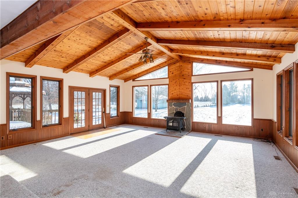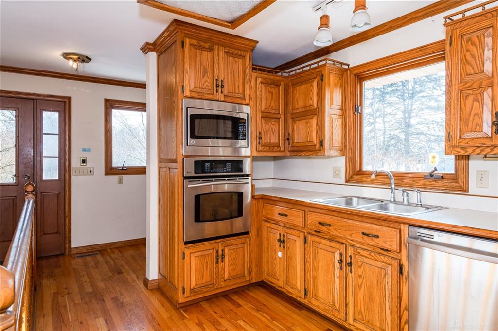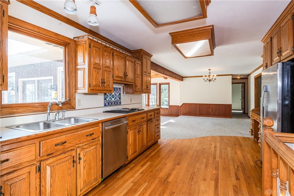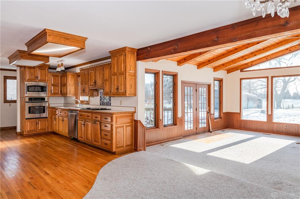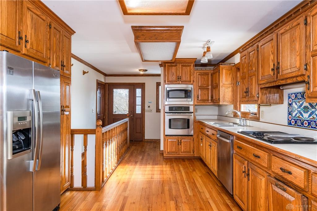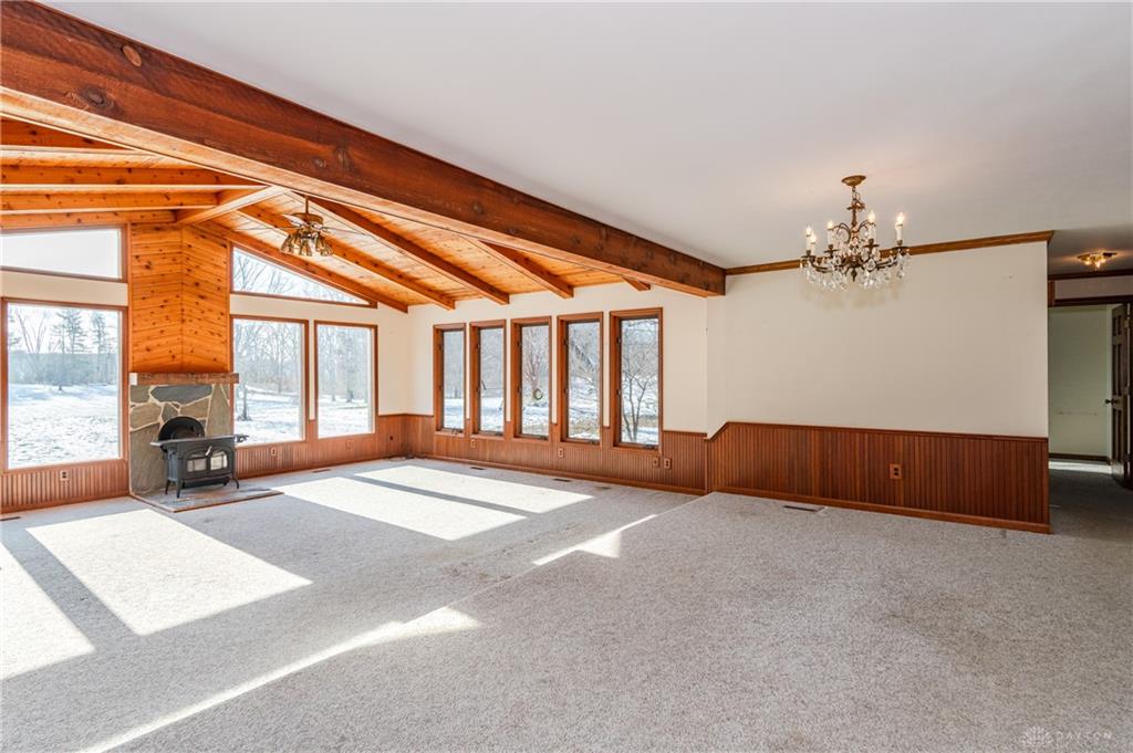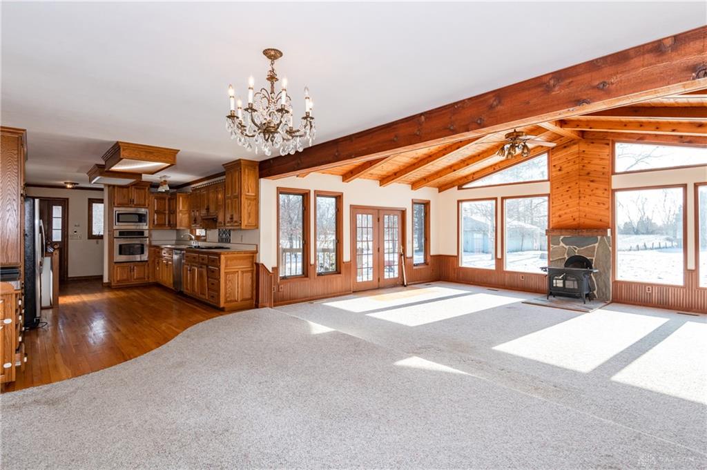 This beautiful, wooded property has Disney like appeal. A whimsical gate greets before you begin down the winding drive, across the bridge, past the gargoyles and deer (no seriously) to discover a charming 3-bedroom 2 bath home. This place is waiting for a prince or princess with a passion for fixer-uppers to love it back to life. Inside you will find beautiful wooden built-ins, custom cabinetry, original hard wood doors and trim, and the most breathtaking views overlooking your land. The enormous living room has access to the side patio and gazebo, perfect for entertaining! Nestled on over 5 acres of privacy, this as-is home is surrounded by flowering fruit trees and a mature tree line that puts on quite the show during the season change. A full basement with a large work room, 2 car garage, and a pole barn 30x24 give you plenty of storage space! Ready to become the King or Queen of a new castle? Please rely on your own measurements and note that this property does lie within 2 parcels of land, Miami and Montgomery county.